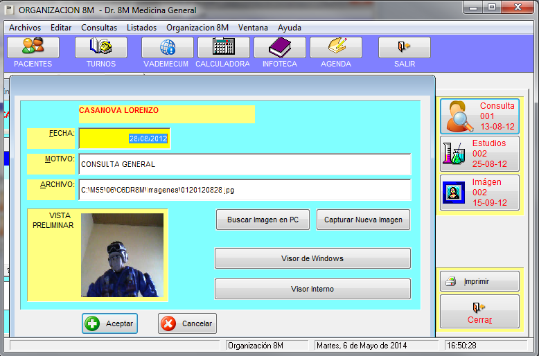 Consulta de Pacientes, en órden Alfabetico, con buscador instantáneo. Muestra la Cantidad y la Fecha del último registro de Consultas, Estudios e Imágenes.
