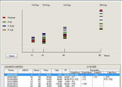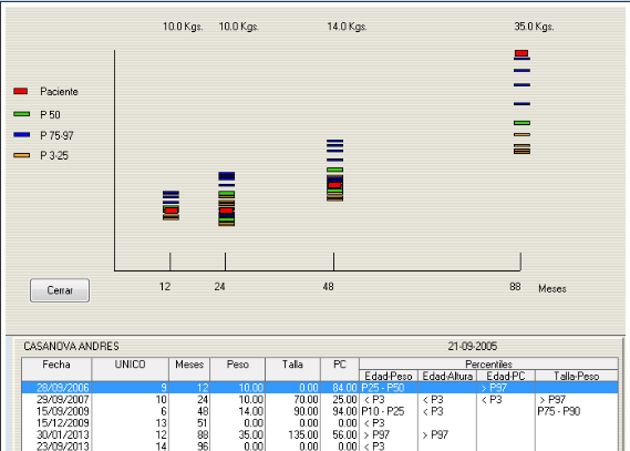 Carga de datos para Percentiles en Pediatría. Mantiene el Histórico de Visitas y Generá un Gráfico Automáticamente. Cada Consulta del Paciente genera un nuevo registro. Permite observar los datos de la Ficha con datos generales y datos de la especialidad y consultar las anteriores visitas del Paciente.